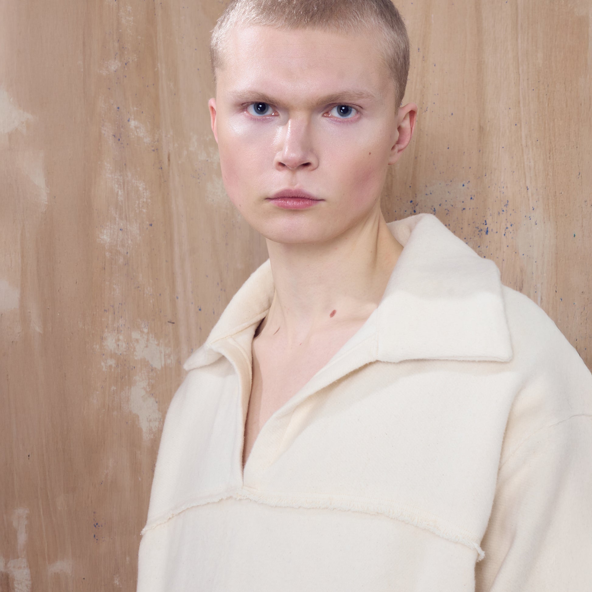 The Balfron Polo is a relaxed, boxy-fit pullover crafted with a clean, modern silhouette. It features an open V neckline, a camp collar, and extra long, wide sleeves. It has a dropped shoulder and a contrast front yoke.