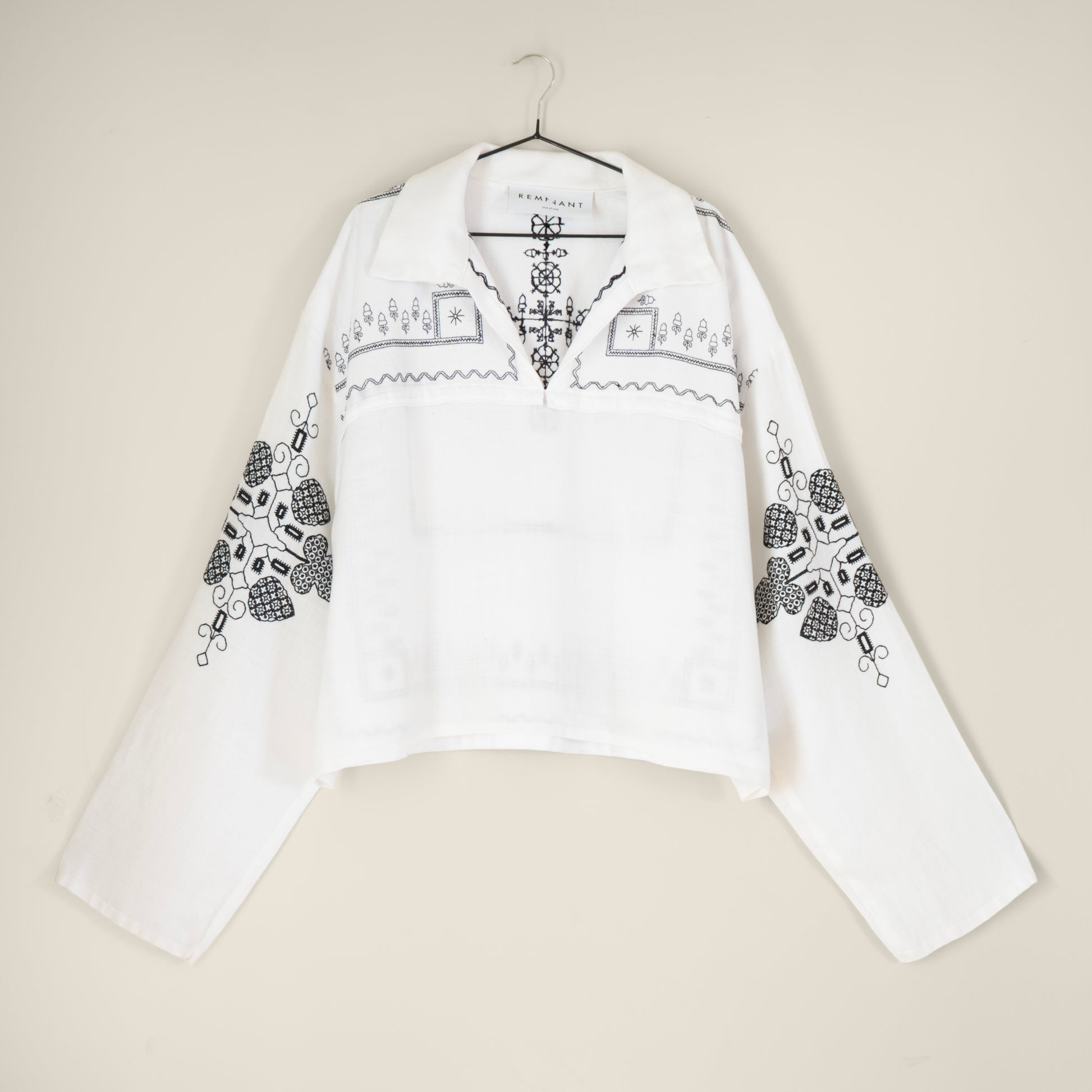 The Balfron Polo is a relaxed, boxy-fit pullover crafted with a clean, modern silhouette. It features an open V neckline, a camp collar, and extra long, wide sleeves. It has a dropped shoulder and a contrast front yoke.