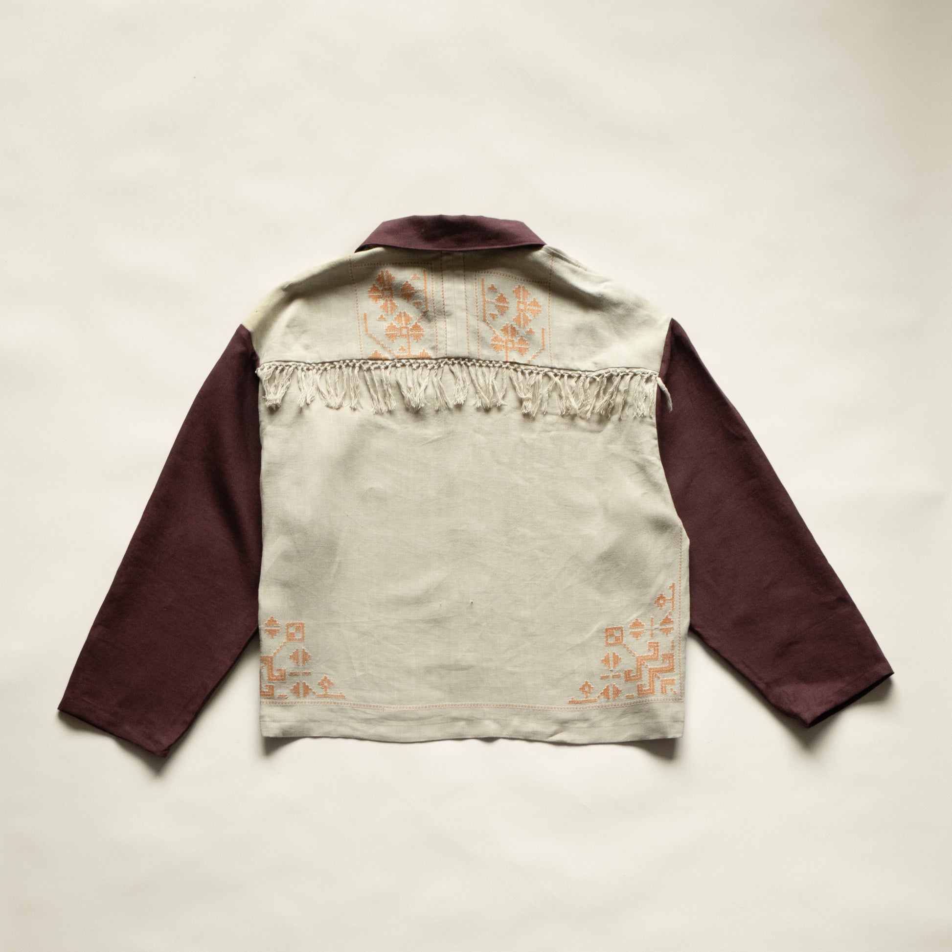 This version is made from a vintage embroidered linen tablecloth and deadstock burgundy linen and features reclaimed vintage buttons and a reclaimed vintage fringe trim.