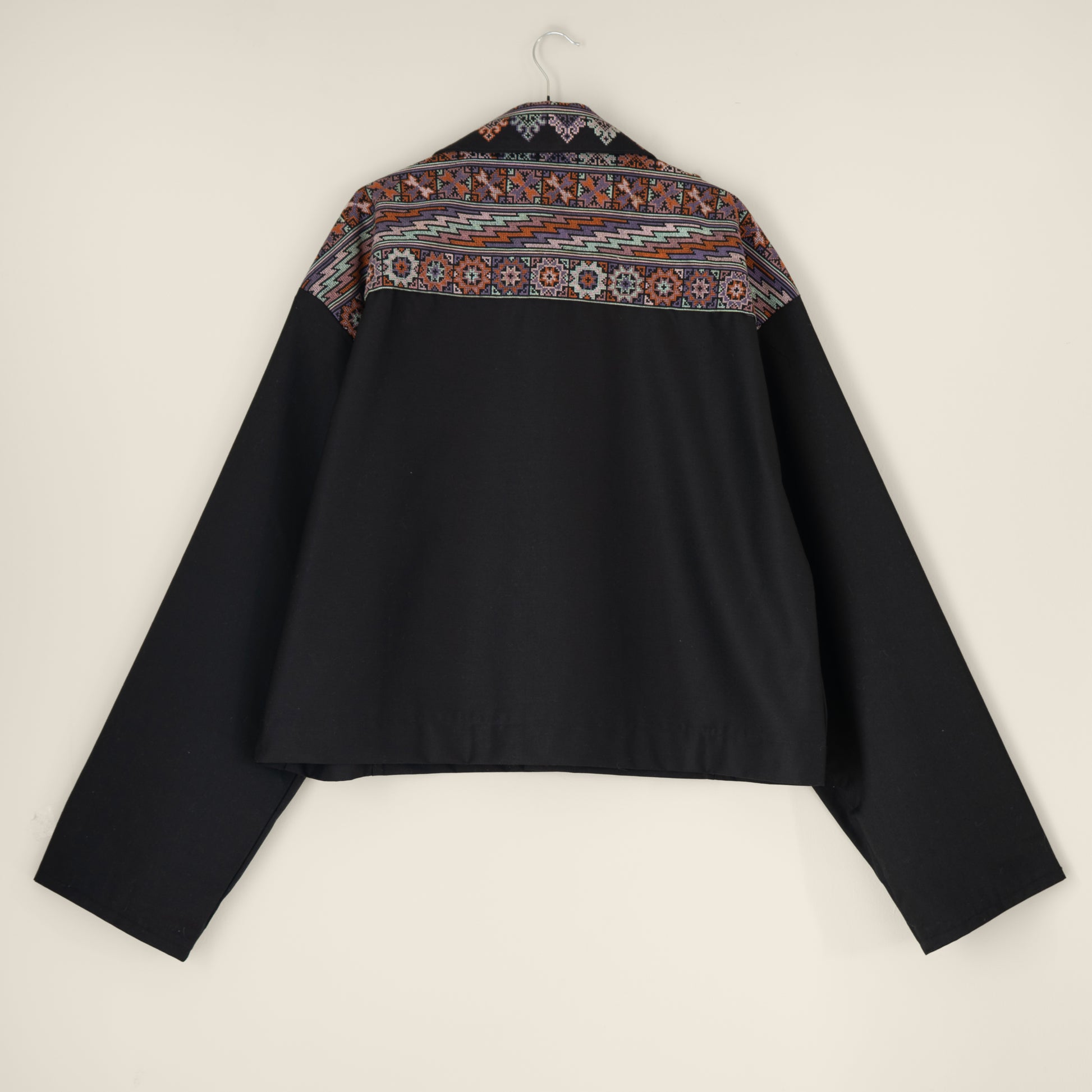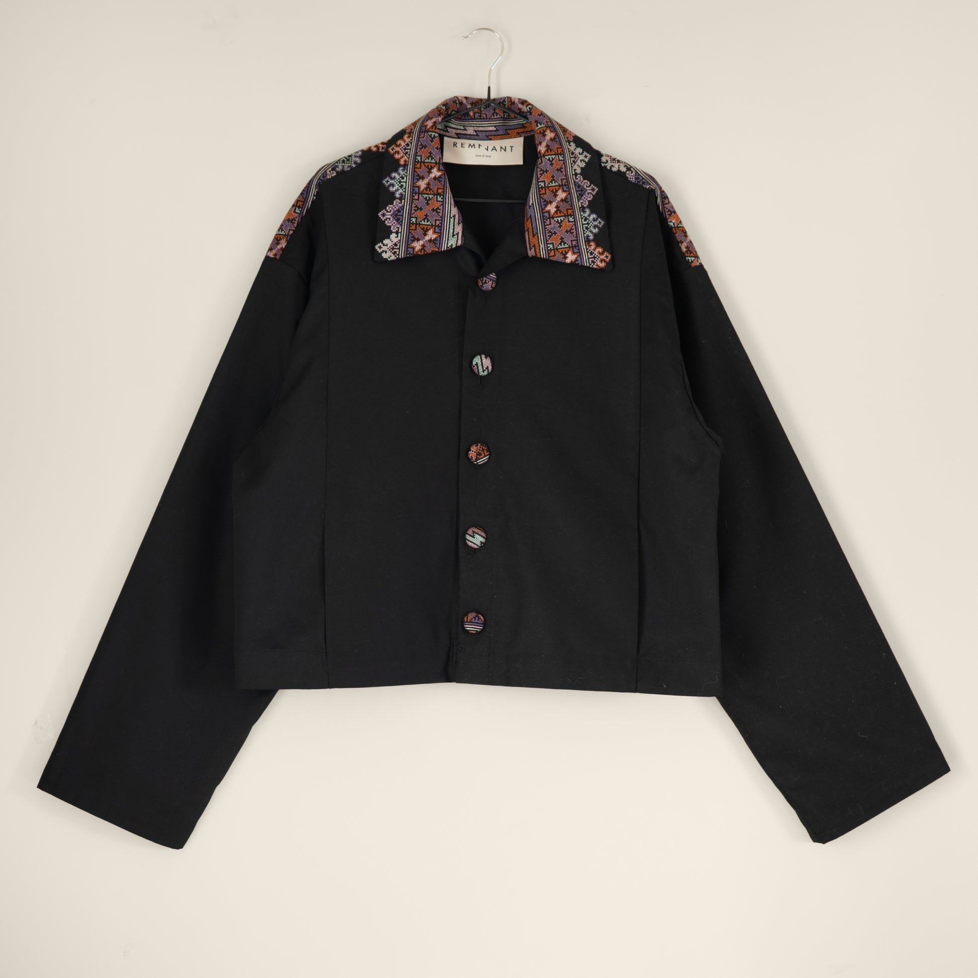 This version is made from a deadstock black wool mix suiting and a vintage embroidered table runner, and features matching fabric covered buttons made from the off cuts of the table runner.