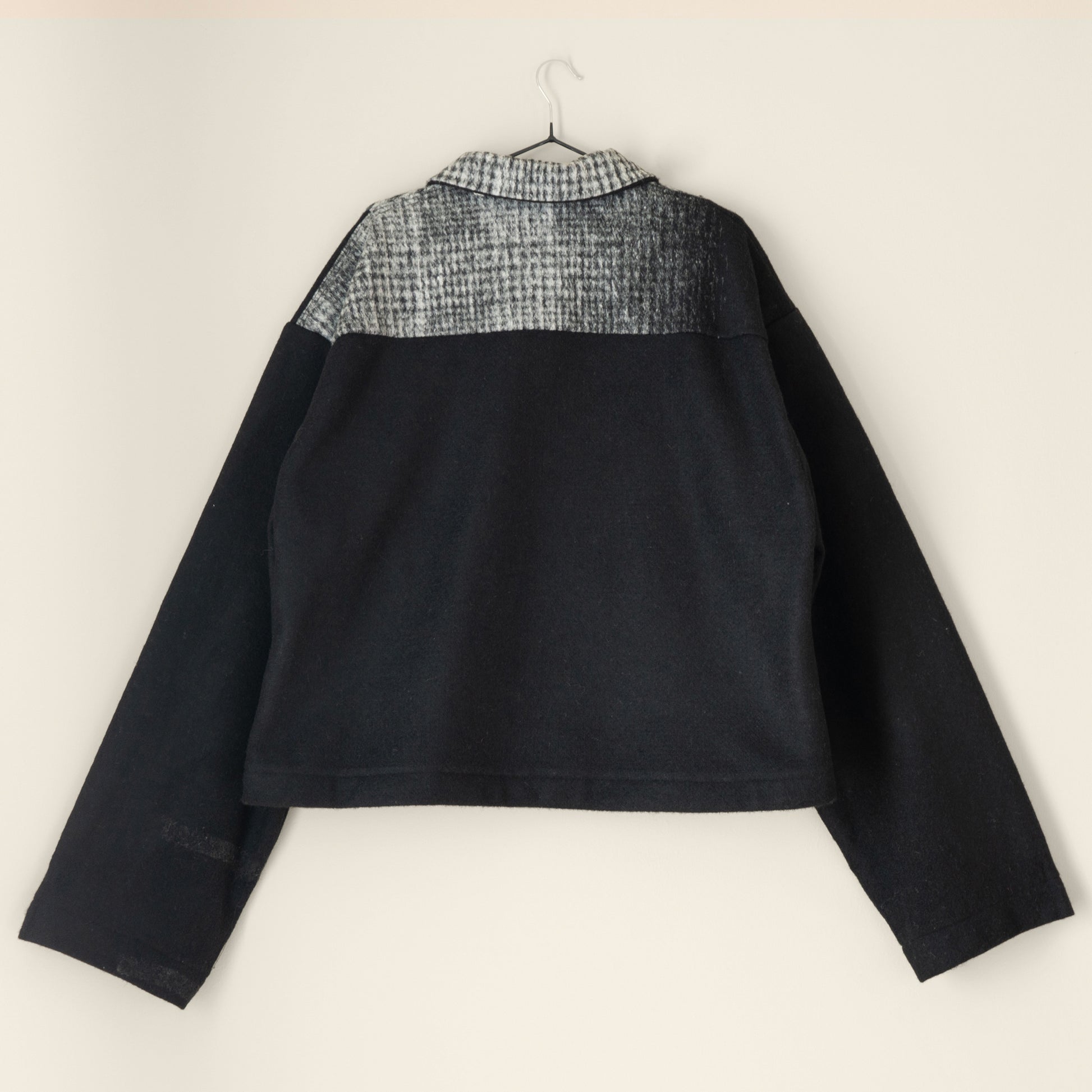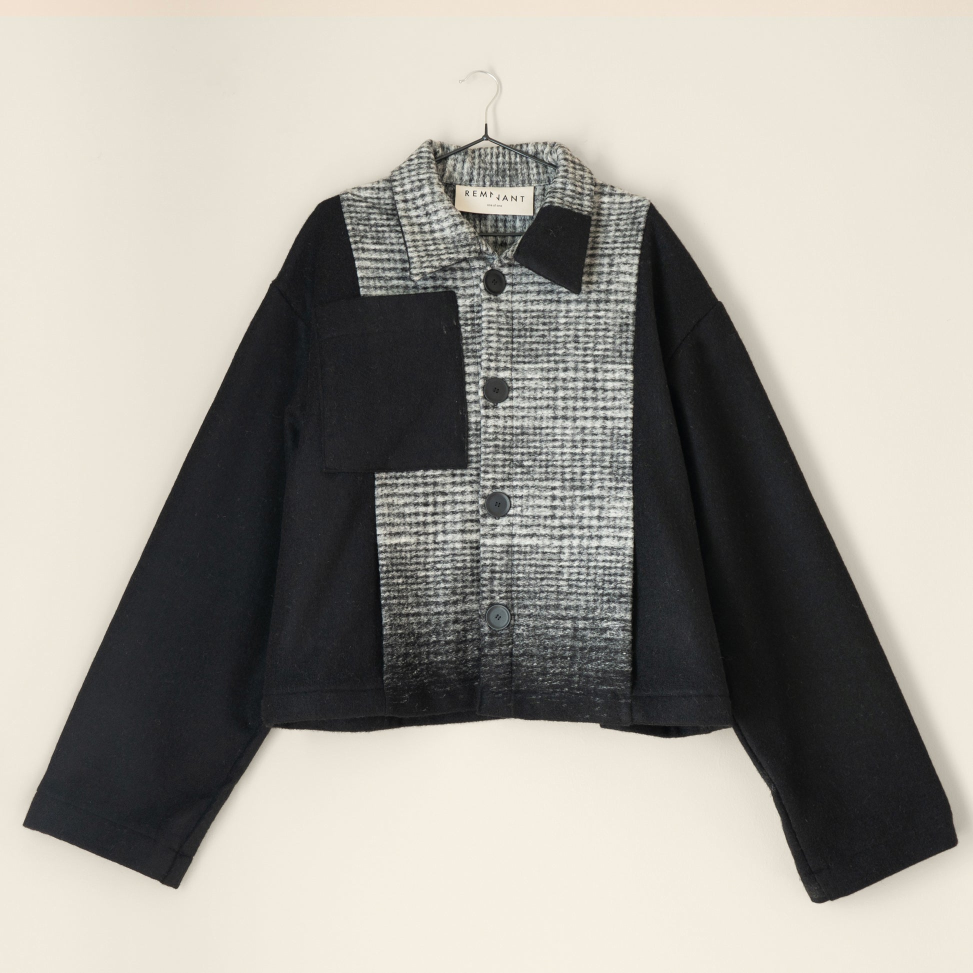 This version is made from a deadstock black and grey ombre wool, and features ex-designer deadstock corozo buttons.