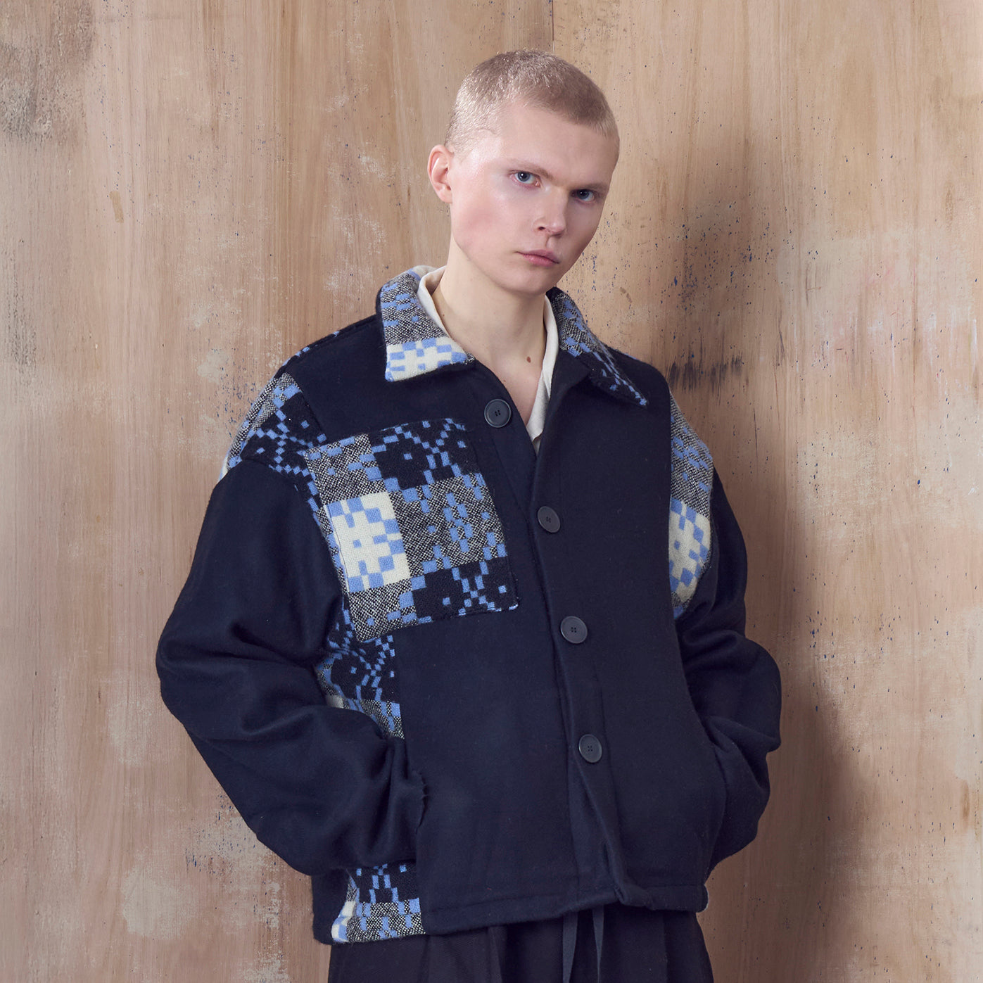 This version is made from a vintage welsh tapestry wool blanket and a deadstock black 100% wool, and features ex-designer deadstock corozo buttons.