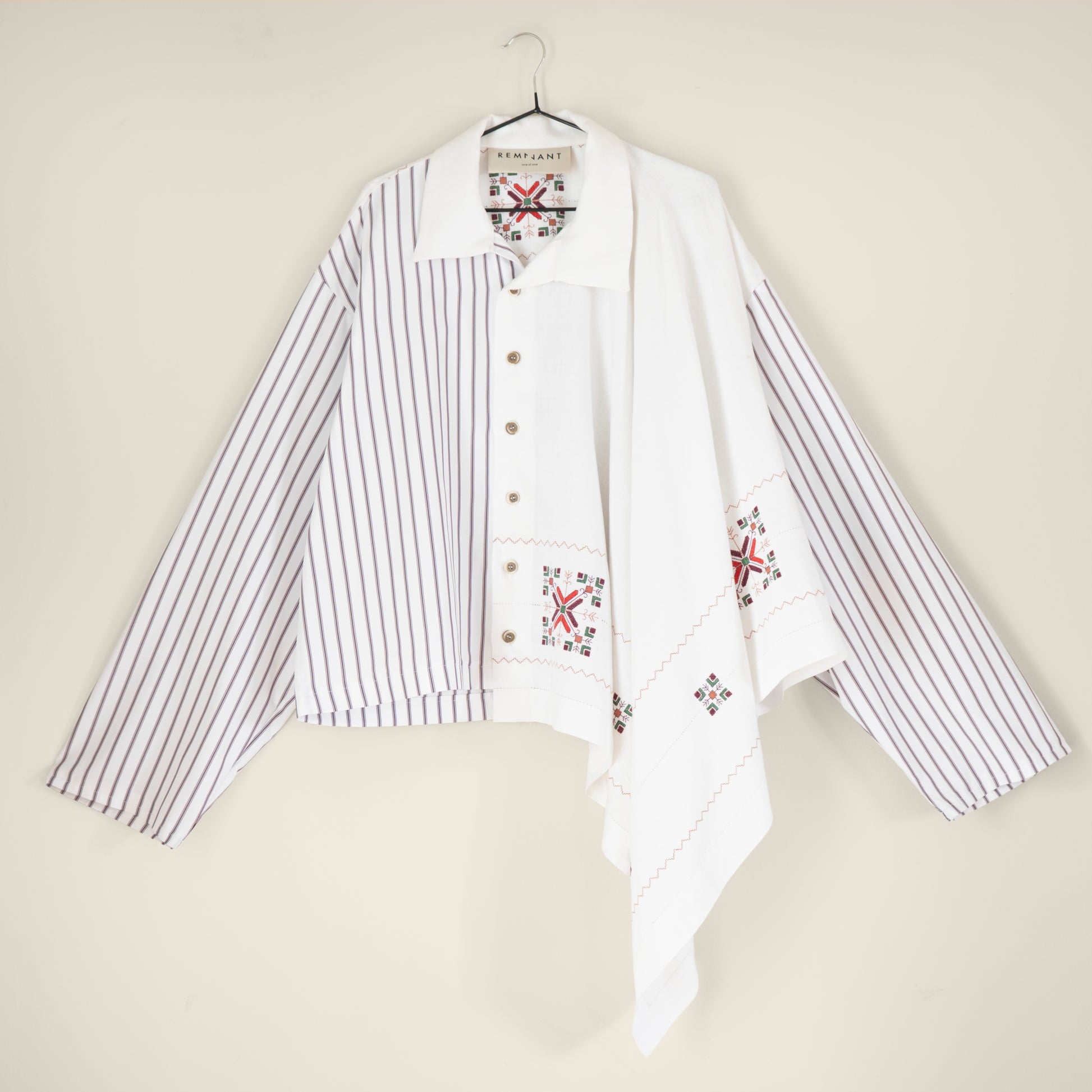 This version is made from a vintage embroidered tablecloth and a deadstock poly-cotton stripe shirting and features reclaimed vintage buttons.