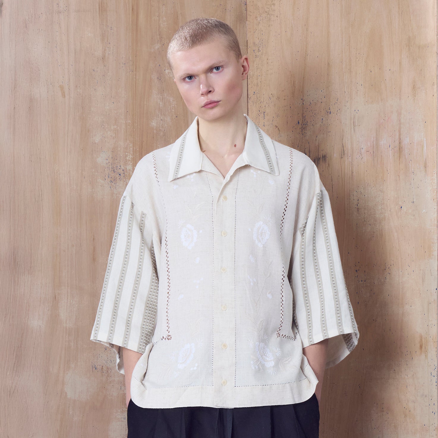 The Trellick Shirt is an oversized, boxy fit shirt with a dropped shoulder and back yoke detail. Designed with a camp collar and short wide sleeves, it blends retro-inspiration with a modern silhouette.